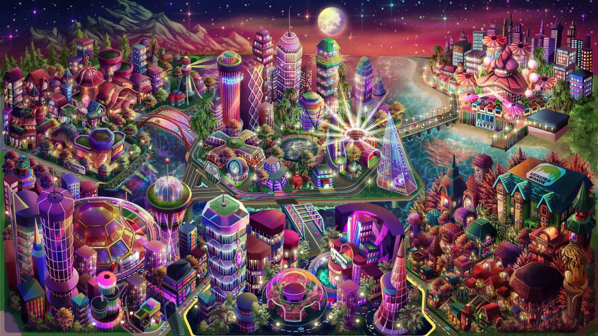 - Город Аксон делится на шесть районов с динамическим циклом суток и погодных условий, что влияет на доступные магазины и активность NPC.